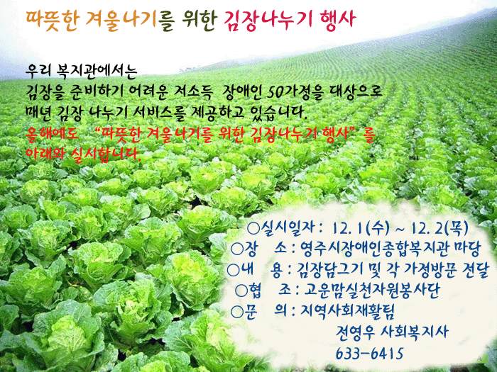 ** 혹시, 주변에 복지관에서 인지하지 못한 어려운 장애인 분들이 계시면 미리 연락 주시기 바랍니다(담당: 사회복지사 전영우).