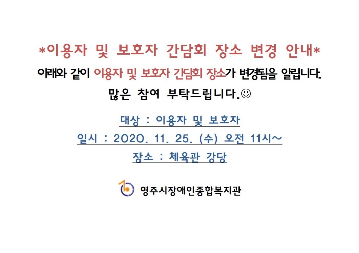 2020년 하반기 이용자 및 보호자 간담회 장소를 체육관 강당으로 변경하오니