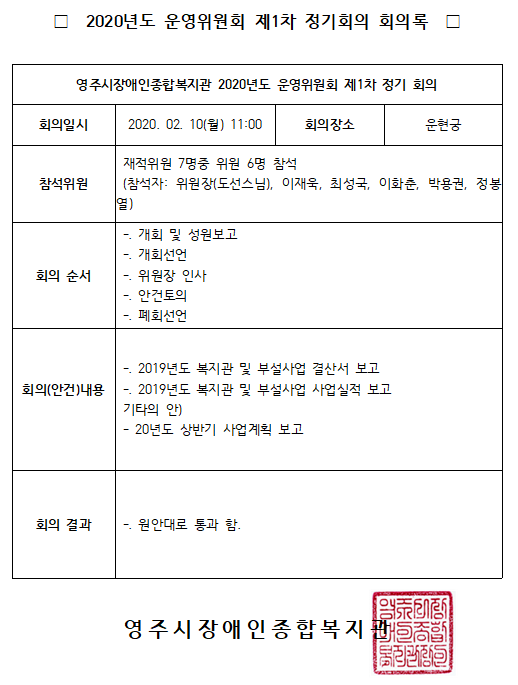 2020년도 운영위원회 제1차 정기회의 결과 공지