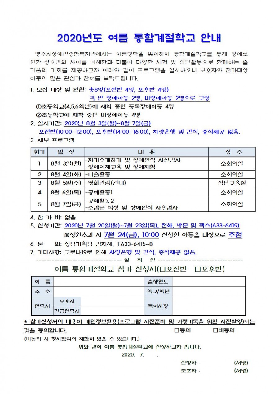 [2020] 여름 통합계절학교 참가자 모집 안내 > 공지사항