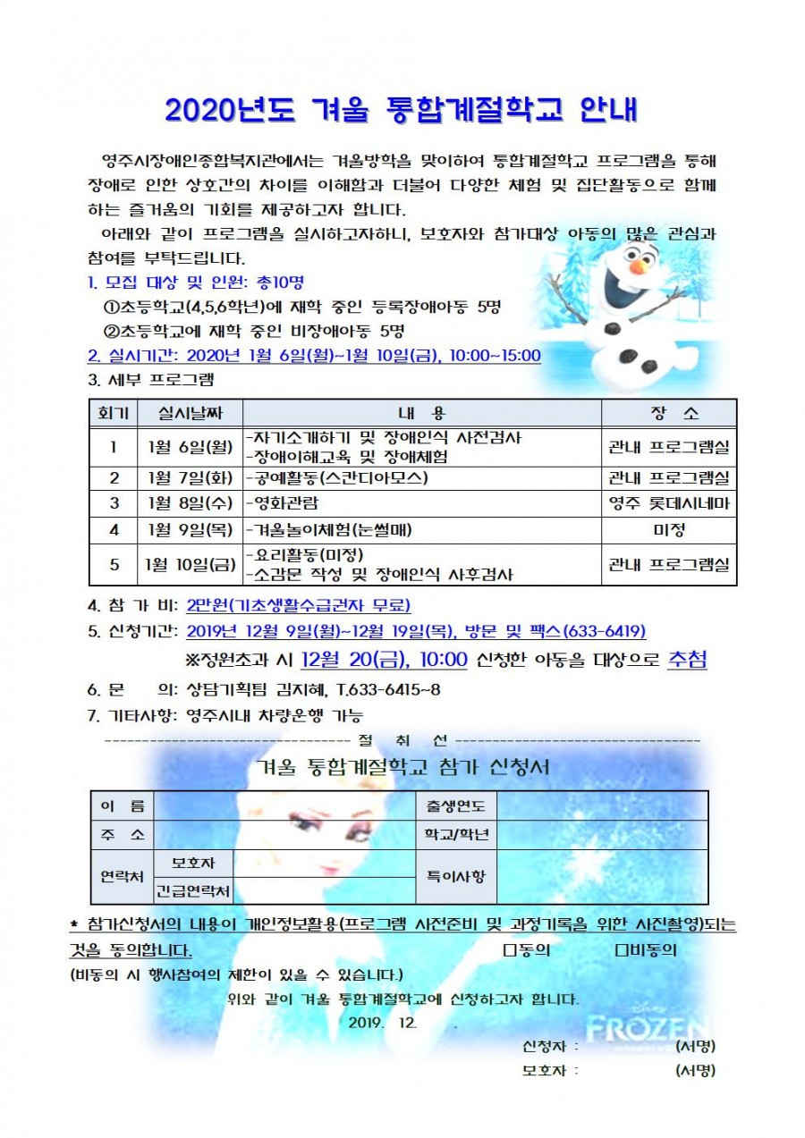 2020년 겨울 통합계절학교 참가자 모집 안내