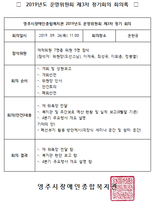 2019년도 운영위원회 제3차 정기회의 결과 공지