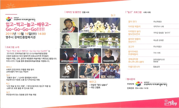 ° 영주시장애인종합복지관에서는 지역주민들에게 다채로운 문화공연 관람기회를 제공하기 위해 한국문화예술위원회가 후원하고, 사)코리아파파로티문화재단이 주최하는 ‘2019 신나는 예술여행’을 실시합니다.