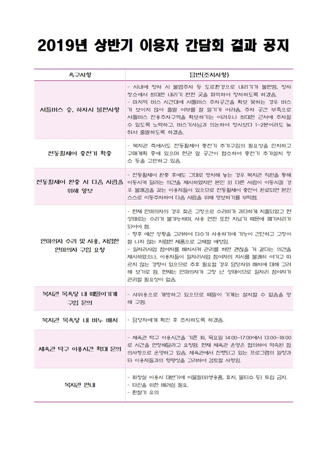 2019년 상반기 이용자 및 보호자 간담회 결과 공지