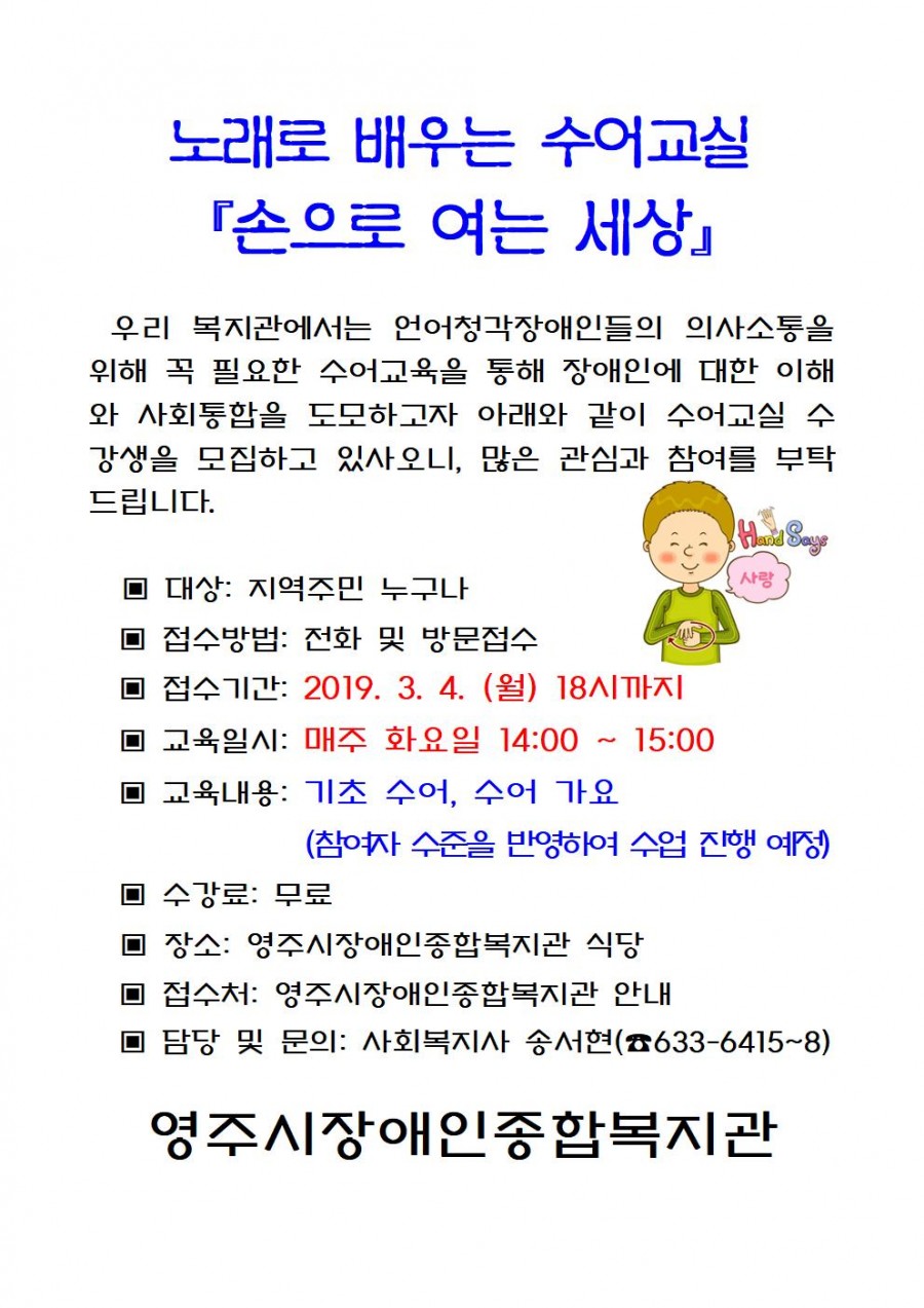 2019년 수어교실 참여자 모집 페이지 정보 작성자 유영학 작성일 19-02-18 11:22 조회6,333회 댓글0건 본문 많은 관심과 참여를 부탁드립니다...*^^* 이전글 다음글 목록