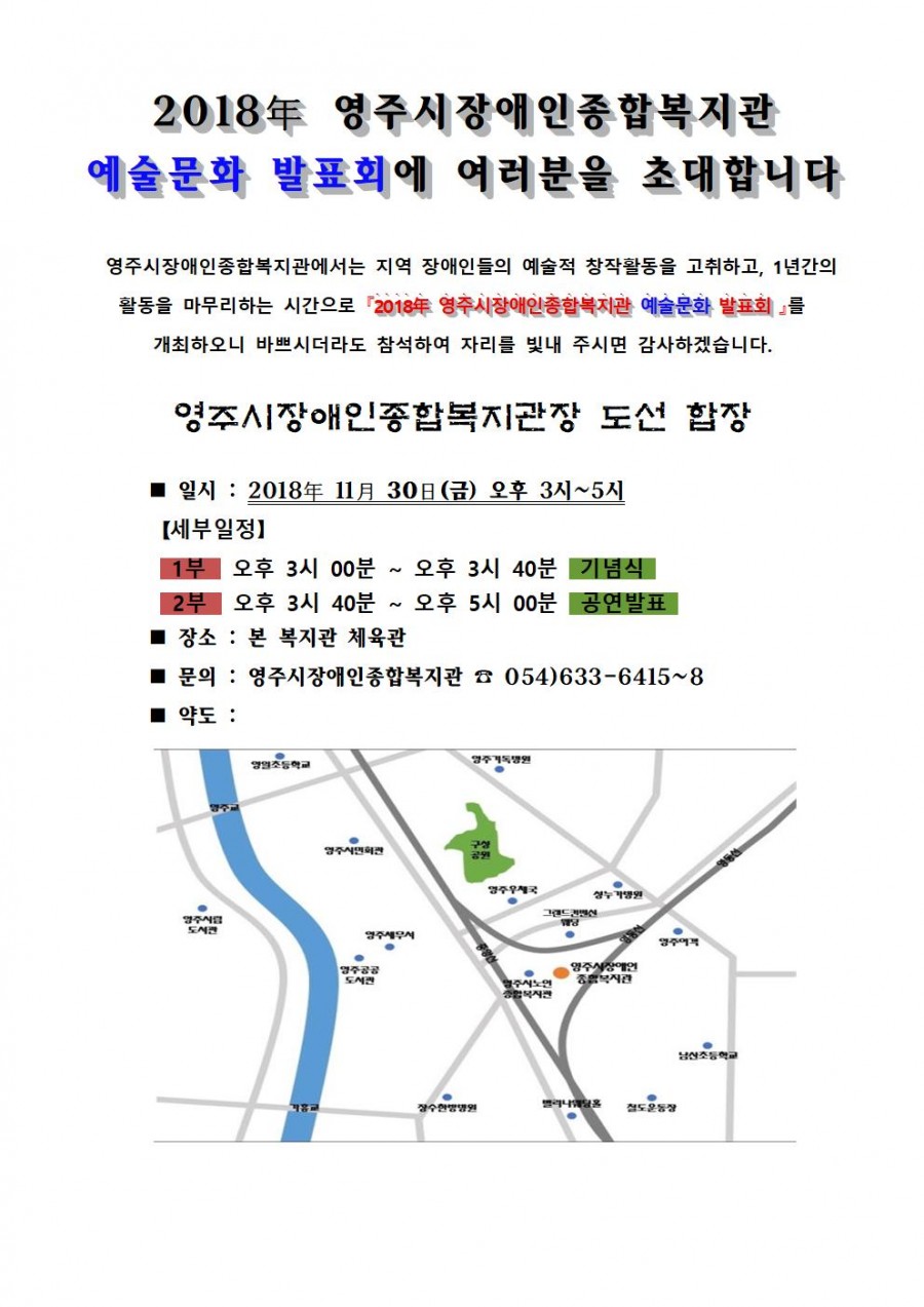 경상북도 영주시 원당로 52번길 25 영주시장애인종합복지관대표번호 : 054-633-6415~8 팩스: 054-633-6419이메일: yjrehab@yjrehab.or.kr