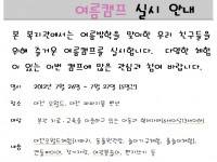 부모님!! 아동캠프는 접수기간을 두고 선착순으로 접수를 받습니다.참고하시어 캠프신청 놓치지마세요!!*신청 및 접수기간 : 7월 12일 오후~7월 16일 오전까지*참가비: 20,000원