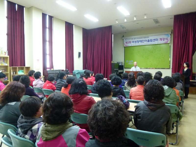 제3회 여성장애인어울림센터 개강식은 2012년 역량강화교육프로그램 이용을 희망하는 여성장애인 35명이 참석한 지역내에서 센터 역할과 기능 및 세부사업 소개 와 직업능력개발교육, 스포츠 여가 취미활동 프로그램 오리엔테이션으로 진행되었습니다.