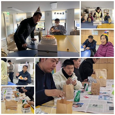 지난 12월 9일(월) 주간보호실에서 생일자 2명을 대상으로 생일지원 서비스를 진행하였다. 특히 이번 생일잔치는 이용자 부모님의 후원으로 수제버거, 사이다, 감자튀김이 추가되어 더욱 풍성하고 즐거운 분위기 속에서 프로그램이 진행되었다.