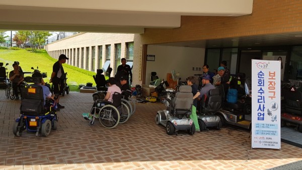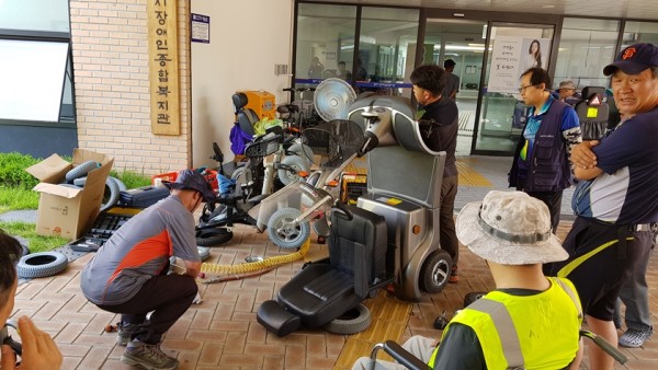우리 복지관에서는 (사)한국척수장애인 경북협회의 '2018년 보장구 수리'와 관련하여 보장구 수리가 필요한 장애인의 신청접수를 받아 2018년 6월 8일(금) 10시부터 15시까지 우리 복지관에서 보장구수리서비스를 실시했습니다. 이날 사전 및 현장접수를 한 장애인 17명에 대한 보장구(전동휠체어, 전동스쿠터, 수동휠체어 등)를 수리 및 점검하였으며, 이를 통해 장애인분들의 일상생활과 이동의 편의를 제공하는데 많은 도움이 되었습니다.