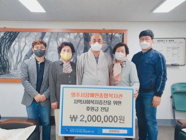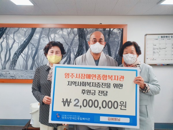 4월 20일(수) 장애인의 날, 영주시장애인종합복지관에 직접 방문이 어려워 어머니이신 김예동 여사님께서 대신 방문하여 후원금을 전달하였습니다.
