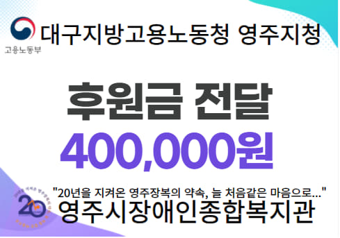 대구지방고용노동청 영주지청은 우리지역 장애인을 위해 지속적인 관심을 갖고 후원하는 기관으로 2월 14일 월요일 코로나19로 어려움을 겪고 있는 지역 장애인분들에게 힘이 되고자 금400,000원의 후원금을 전달하였습니다.