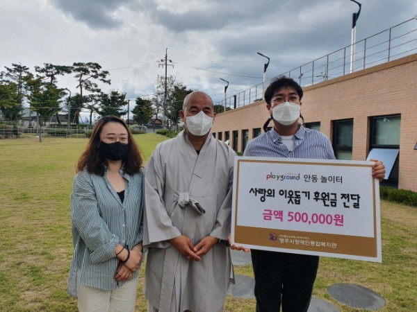 영주시장애인종합복지관 관장(도선스님)은 지역이웃의 어려움을 잊지 않고 물심양면 도움을 주는 안동 놀이터(김민섭 대표)측에 깊은 감사의 인사를 전하였습니다.