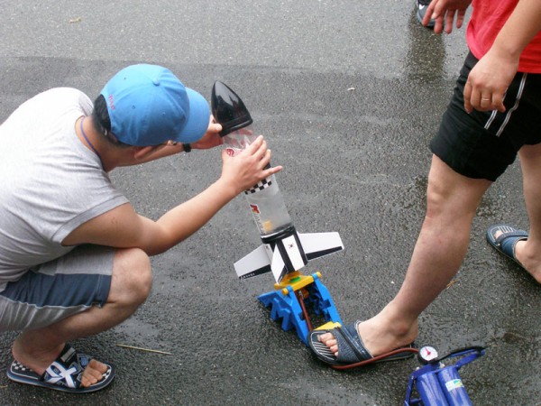 창의력 개발놀이에서 만든 물로켓을 쏘아 올리는 모습입니다.