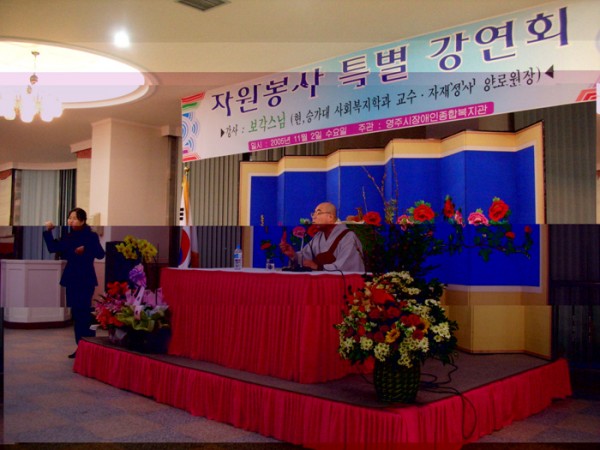 현재 승가대 사회복지학과 교수님이시며 자재정사 양로원장님으로 계시는 보각스님의 '자원봉사자 역량강화를 위한 자세'라는 주제로 강연을 하시고 있는 모습입니다.