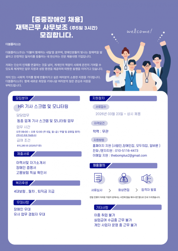 더봄플러스(주) - 재택근무 사무보조(중증장애인) 직원채용 추가모집