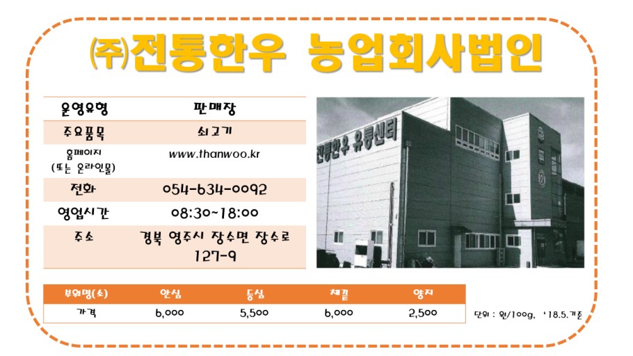 (주)전통한우 농업회사법인 페이지 정보 작성자 황영석 작성일 21-05-03 16:28 조회2,431회 댓글0건 본문 상호 (주)전통한우 농업회사법인 업종 식육점 주소 경북 영주시 장수면 장수로 127-9 주소분류 장수면 상태 분양중 위치 일진베어링 건너편 연락처 054-634-0092 업체 지도 이전글 다음글 목록